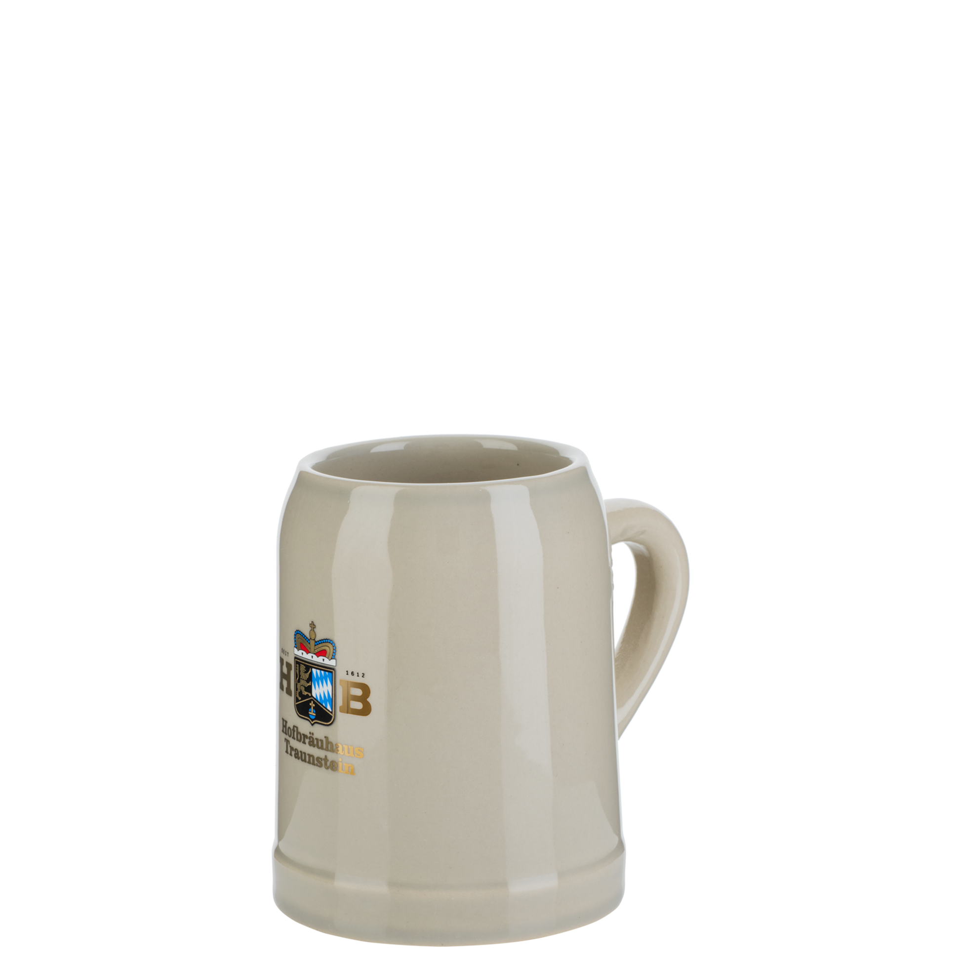 Traditional stein without a lid, smooth glazed with the noble Hofbräuhaus Traunstein coat of arms with real gold plating. Keeps our pale ales particularly fresh and cool.