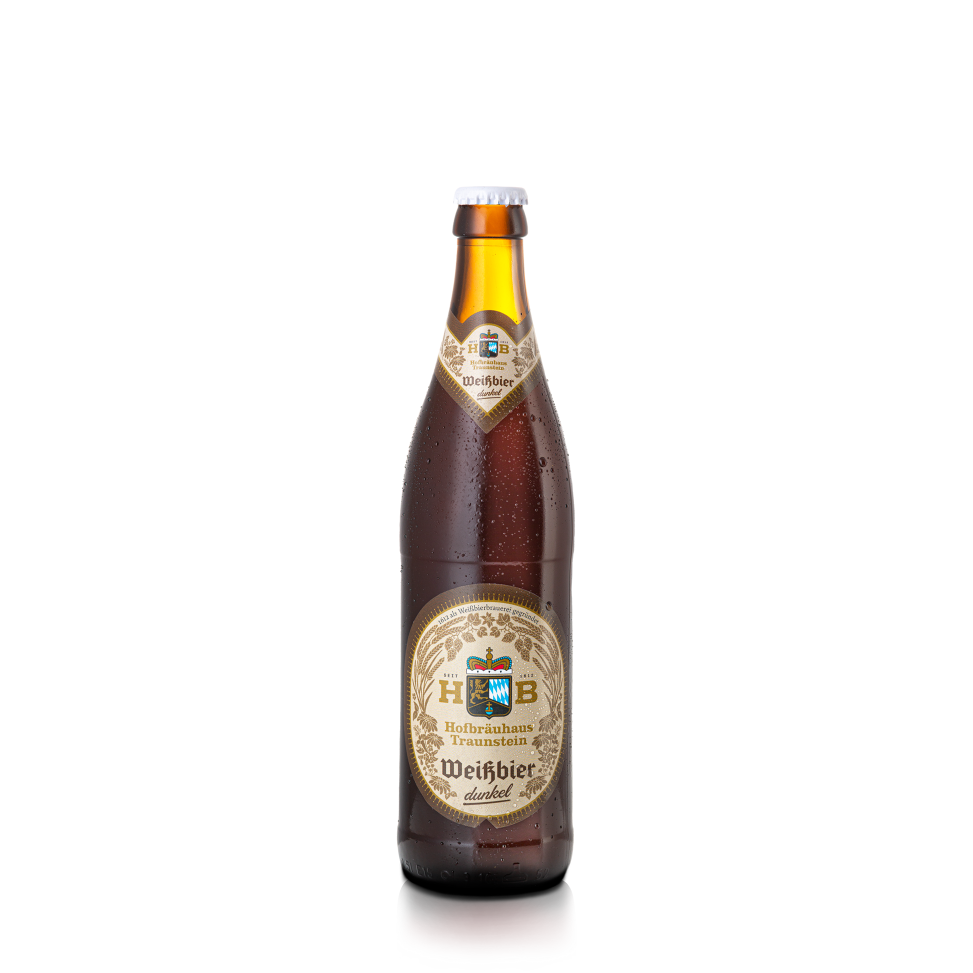 Hazelnut brown with fine yeast. A clearly deep, spicy-smoky taste from the dark special malt, with a soft note of fruit. Our Hofbräuhaus Traunstein Weißbier dark is brewed according to our special old Bavarian brewing process.