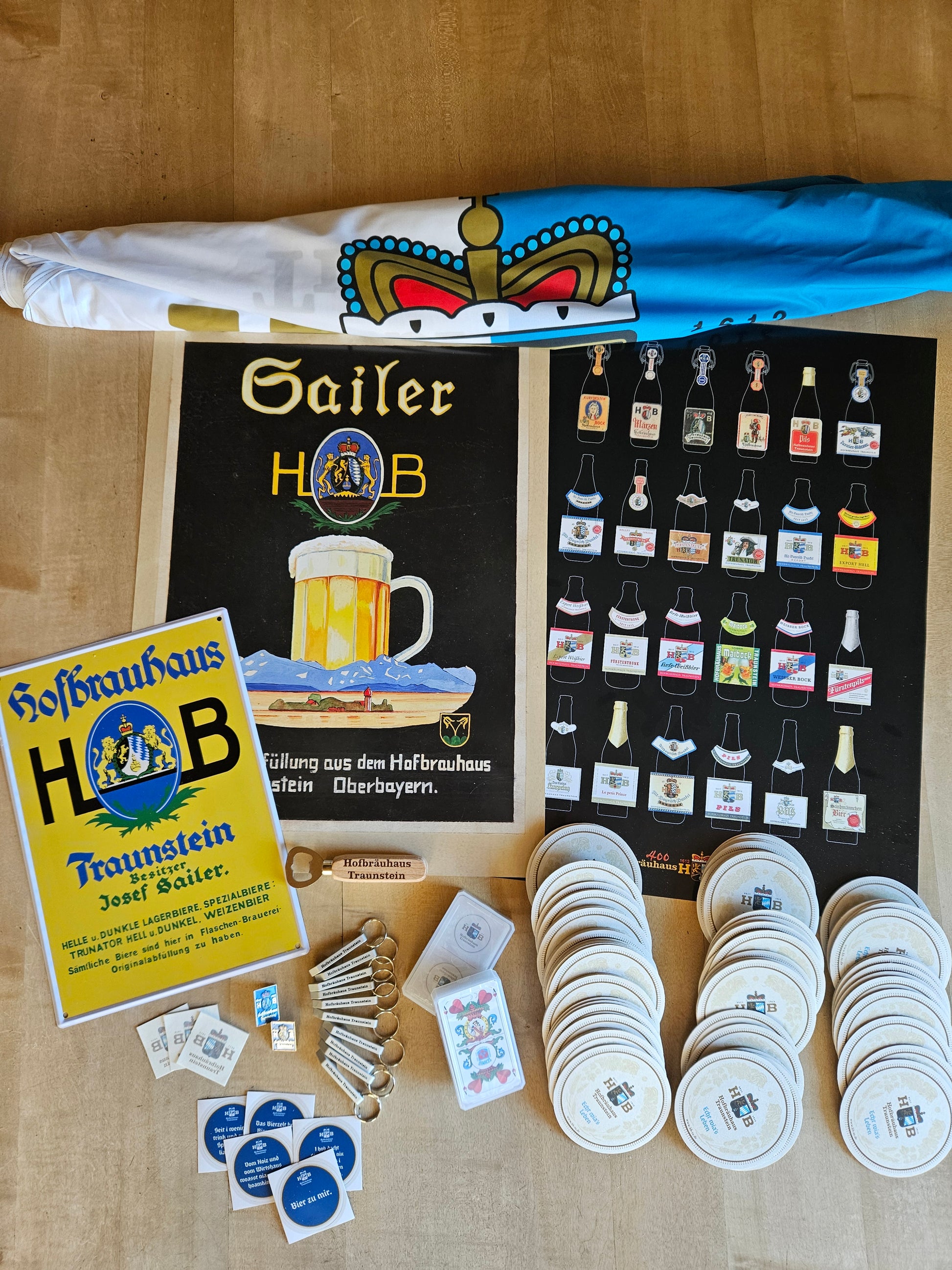 Attenzione Hofei-Hüttn e rimorchi edili! Abbiamo l'attrezzatura perfetta per te: una bandiera Hofei su un bastone di legno, due poster, un cartello nostalgico in metallo, un pacchetto di sottobicchieri, un apriscatole in legno, alcuni piccoli apriscatole in metallo, due set di carte da gioco, adesivi, spille con logo per attaccare e tatuaggi Hofei. Un pacchetto per fan con i must-have assoluti!🥳