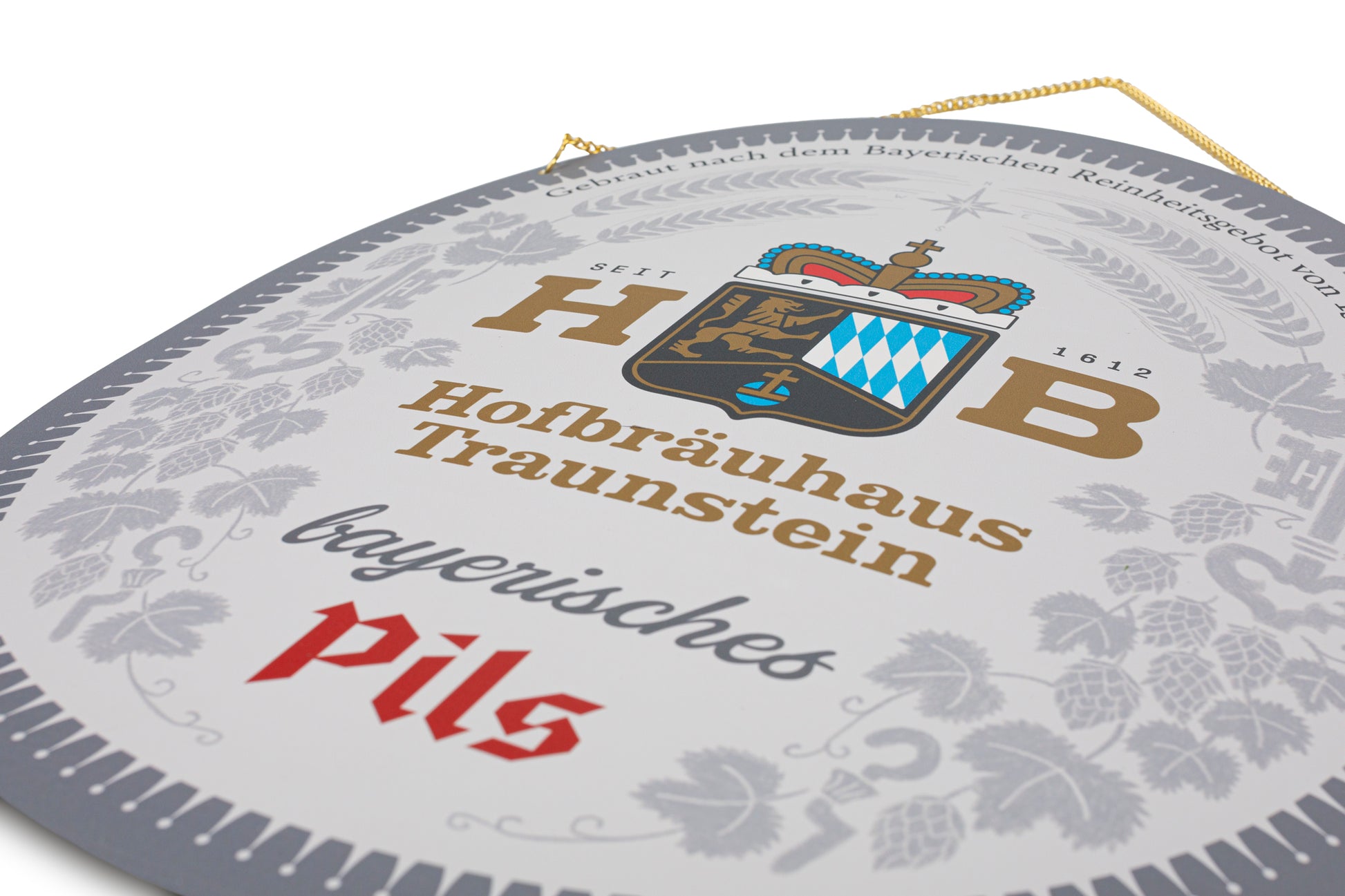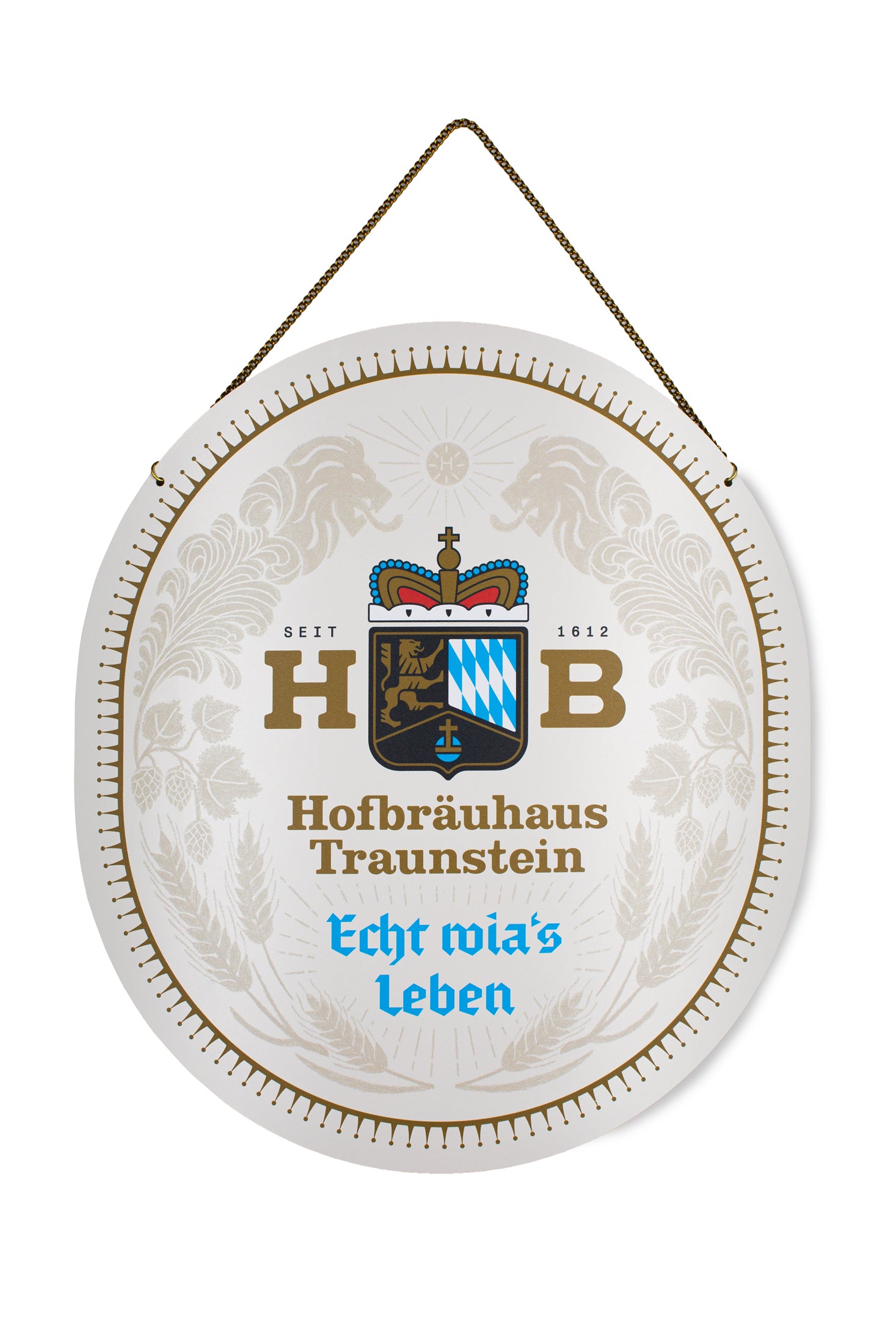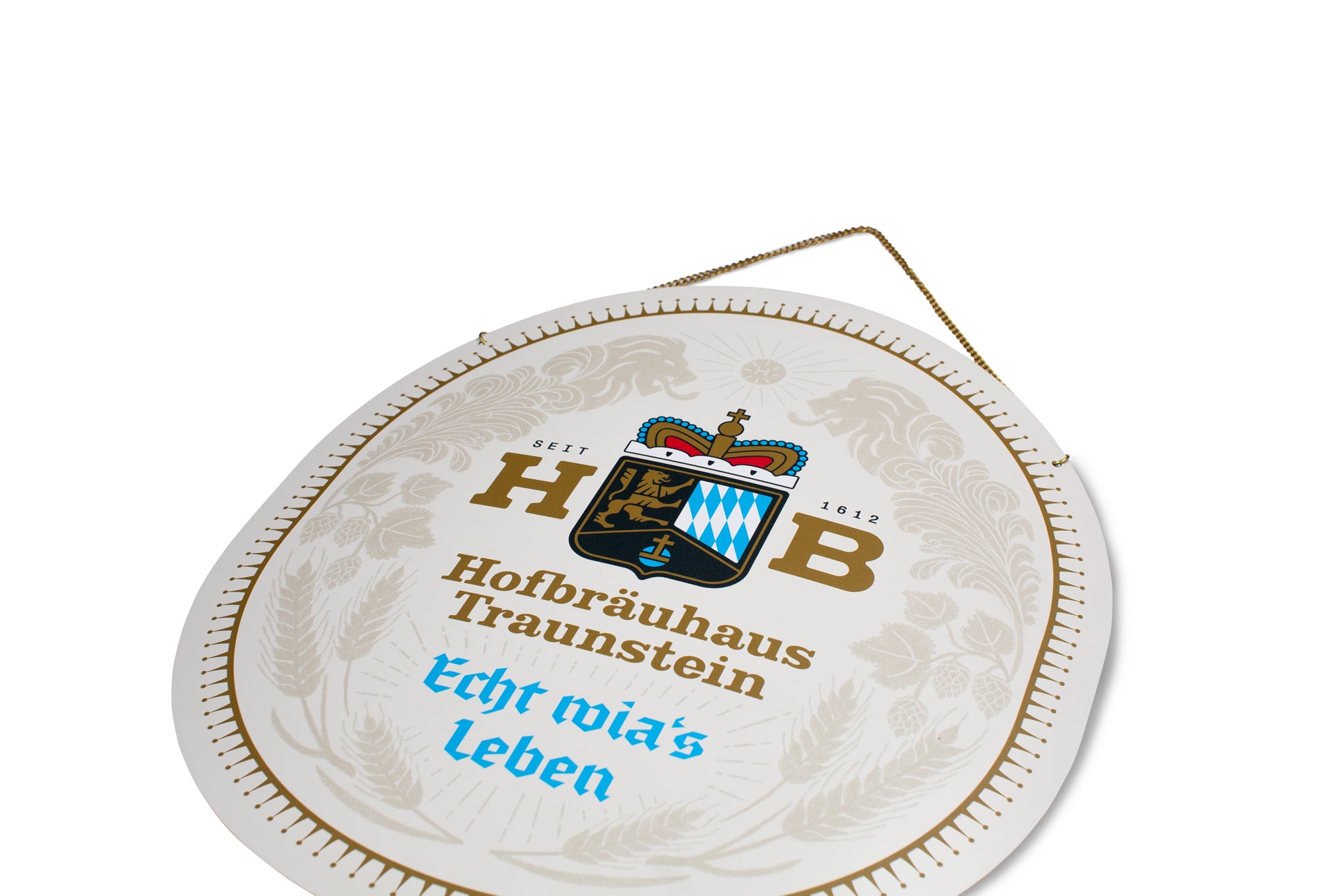 Natürlich auch nur mit dem Hofbräuhaus Traunstein Schriftzug. Ganz im Stil unserer Email-Werbeschilder mit goldfarbener Kette.